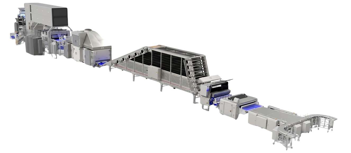 The line features 8 parallel rows for simultaneous production of multiple flour tortillas. This increases the output significantly, making it suitable for large manufacturing plants.